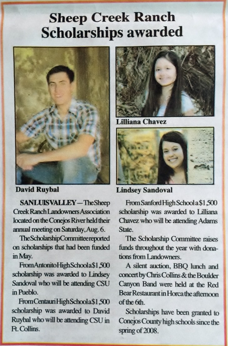 Sheep Creek Land Owners Scholarship Recipients were recently published in two local newspapers, the Conejos County Citizen and the Valley Courier (see article from Conejos Co Citizen) Scholarship-Recipients.jpg (4748 downloads ) Three Conejos County students were awarded $1500 each from the SCLA Scholarship Fund. Thanks to the generous donations of our Conejos Canyon Friends and Sheep Creek Land Owners, and of course, Chris Collins and the Boulder Canyon Band for putting on an incredible concert. We could not have provided these scholarships without everyone’s help and contributions.
